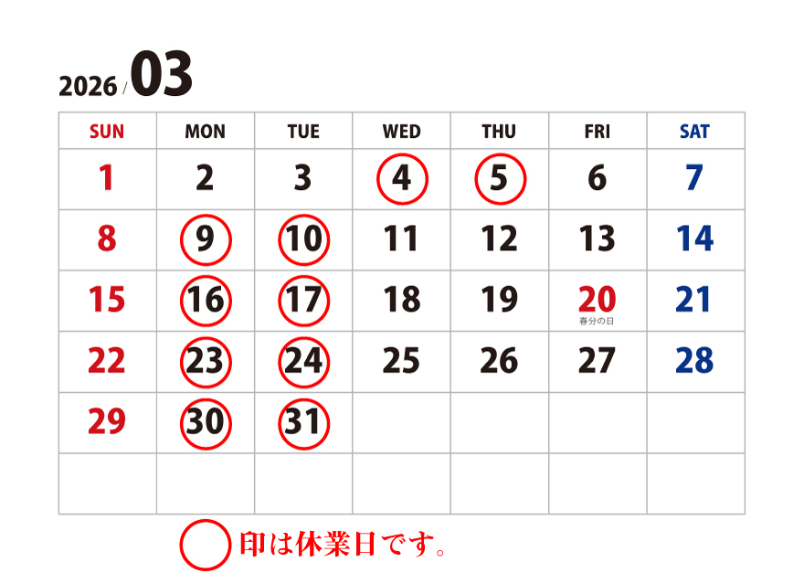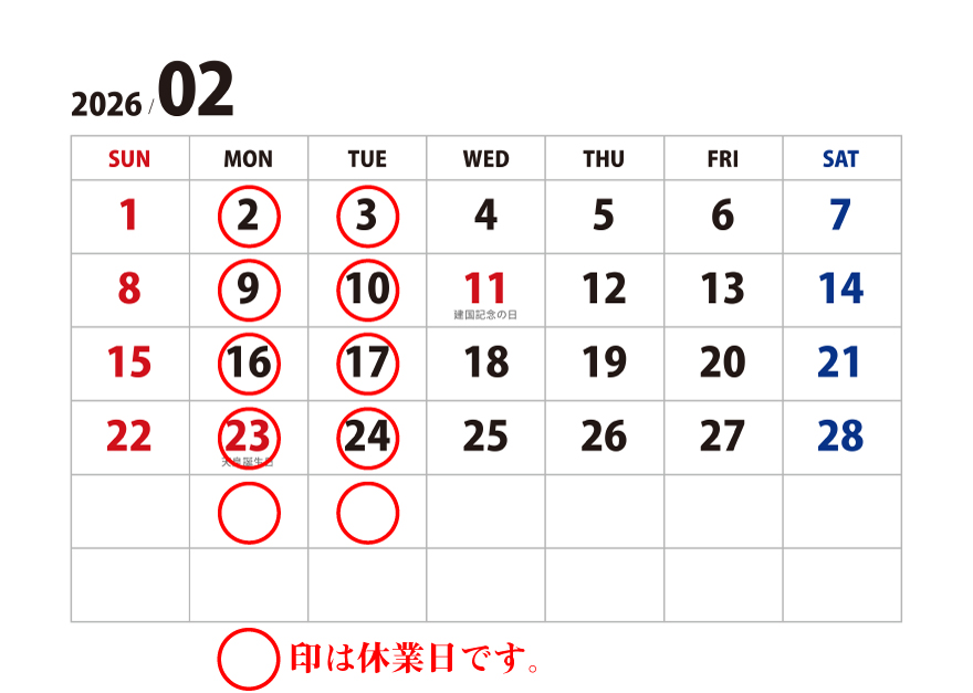 2月のお店定休日をご案内いたします。